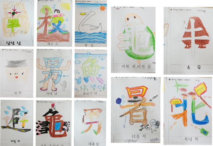 7월 수업 마지막날~ 아이들과 함께 한자는 "그림"이다라는 주제로 한자를 그림으로 표현하는 시간을 가졌습니다. 동그라미가 없는 그림~~ 해도 네모 입도 네모
