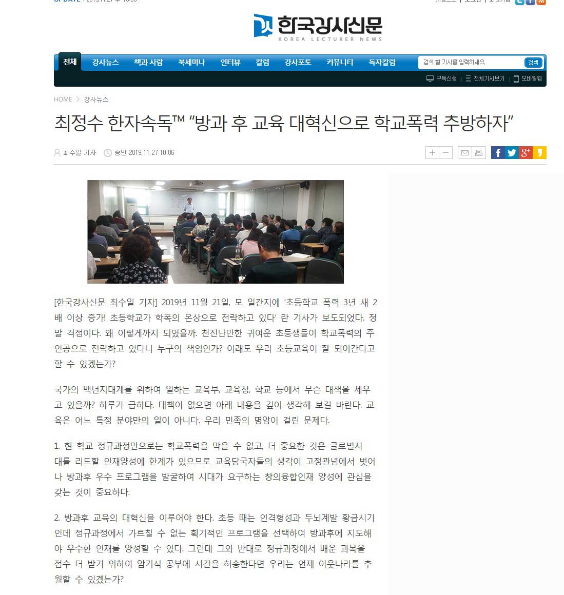 최정수 한자속독™ “방과 후 교육 대혁신으로 학교폭력 추방하자”