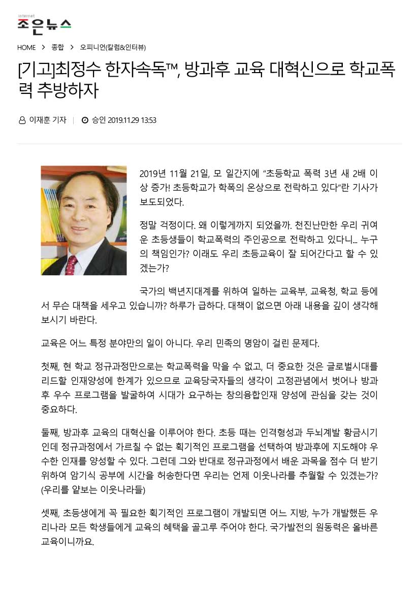 30여 년간 연구하여 개발한 최정수한자속독으로 학교폭력 없어지는 것은 물론 우리나라 아이들 모두 창의융합 인재로 성장하여 장래 조국의 튼튼한 기둥이 될 수 있도록 온 국민 이 지혜를 모으자. 이것이 진정한 애국의 길이다.