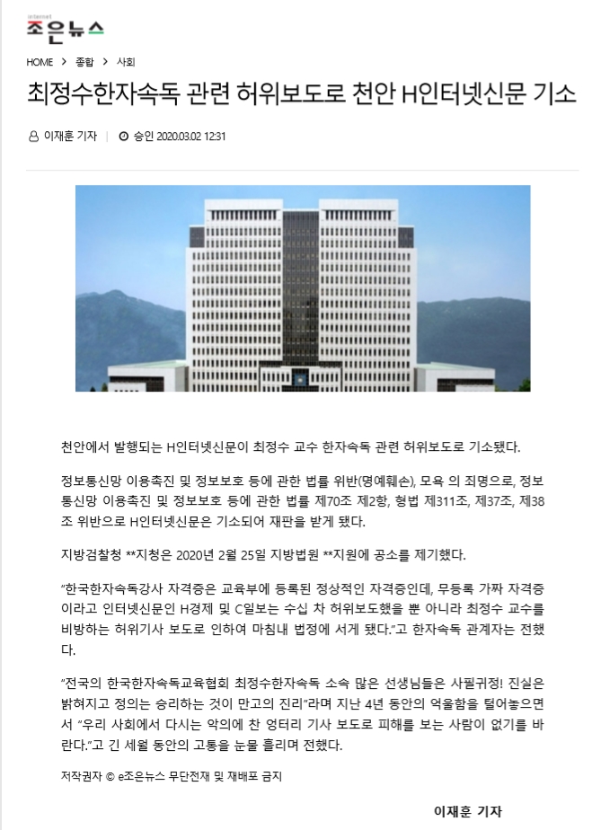 최정수한자속독 관련 허위보도로 천안 H인터넷신문 기소 기사입력 2020.03.02 17:43 댓글 0 #최정수한자속독 #한자속독 #방과후교육 #방과후강사 #인성교육 #두뇌계발 #집중력 #독서능력 #한자 #강사교육 #직업교육 <저작권자ⓒ최정수박사한자속독뉴스 & www.hanjasrnews.com 무단전재-재배포금지. > BEST 뉴스 위로 목록 이름 비밀번호 자동등록방지 34831 등록
