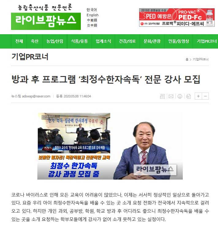 코로나 바이러스로 인해 모든 교육이 어려움이 많았으나, 이제는 서서히 정상적인 일상으로 돌아가고 있다. 요즘 우리 아이 최정수한자속독을 배울 수 있는 곳 소개 요청 전화가 전국에서 지속적으로 걸려오고 있다. 하지만 개인 과외, 공부방, 학원, 학교 방과 후 어디라도 좋으니 최정수한자속독을 배울 수 있는 곳을 소개 요청하는 학부모들에게 강사가 없어 소개 못하고 있는 실정이다.
