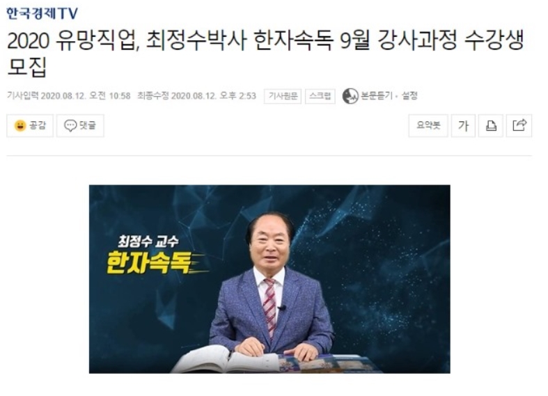 한국경제TV2020.8.12 기사입력 2020.08.14 16:41 댓글 0 http://www.wowtv.co.kr/NewsCenter/News/Read?articleId=A202008120184&t=KO [최석 기자 bjt50@daum.net] 이 기자의 다른 기사 보기 #최정수한자속독 #한자속독 #방과후교육 #방과후강사 #인성교육 #두뇌계발 #집중력 #독서능력 #한자 #강사교육 #직업교육 #대한민국한자검정시험 <저작권자ⓒ최정수박사한자속독뉴스 & www.hanjasrnews.com 무단전재-재배포금지. > BEST 뉴스 위로 목록 이름 비밀번호 자동등록방지 27854 등록