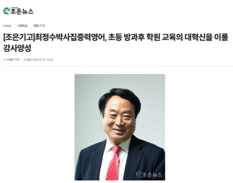 조은뉴스 "최정수박사집중력영어, 초등 방과후 학원 교육의 대혁신을 이룰 강사양성" 보도 2022.3.29 기사입력 2022.03.29 10:52 댓글 0 http://www.egn.kr/news/articleView.html?idxno=201891 [박성은 기자 bjt50@daum.net] 이 기자의 다른 기사 보기 #최정수박사집중력영어속독 #집중력영어속독 #최정수한자속독 #한자속독 #두뇌계발 #집중력 #한자 #독서능력 #인성교육 #방과후강사 #방과후교사 #강사양성 #강사교육 #주부취업 #30대취업 #40대취업 #50대취업 #20대취업 #강사모집 #주부일자리 #미래유망직종 #평생교육원 #초등방과후 #최정수박사한자속독 #한자속독 #강사자격증취득 #방과후교사 #온라인자격증 #온라인수업 #인터넷강의 #자격증취득 #방과후선생님 #한자선생님 #메타인지교육 #자기주도학습 <저작권자ⓒ최정수박사한자속독뉴스 & www.hanjasrnews.com 무단전재-재배포금지. > BEST 뉴스 위로 목록 이름 비밀번호 자동등록방지 79740 등록