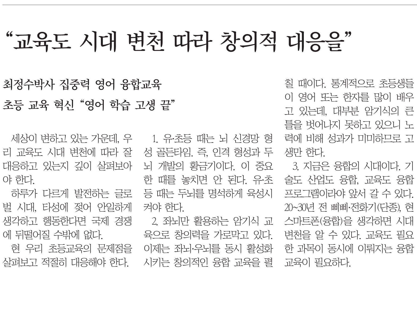 크리스천투데이 신문 "교육도 시대변천에 따라 창의적 대응을" 2022.4.20자 25면 기사입력 2022.04.19 16:09 댓글 0 [김주아 기자 bjt50@daum.net] 이 기자의 다른 기사 보기 #최정수박사집중력영어속독 #집중력영어속독 #최정수한자속독 #한자속독 #두뇌계발 #집중력 #한자 #독서능력 #인성교육 #방과후강사 #방과후교사 #강사양성 #강사교육 #주부취업 #30대취업 #40대취업 #50대취업 #20대취업 #강사모집 #주부일자리 #미래유망직종 #평생교육원 #초등방과후 #최정수박사한자속독 #한자속독 #강사자격증취득 #방과후교사 #온라인자격증 #온라인수업 #인터넷강의 #자격증취득 #방과후선생님 #한자선생님 #메타인지교육 #자기주도학습 <저작권자ⓒ최정수박사한자속독뉴스 & www.hanjasrnews.com 무단전재-재배포금지. > BEST 뉴스 위로 목록 이름 비밀번호 자동등록방지 54607 등록