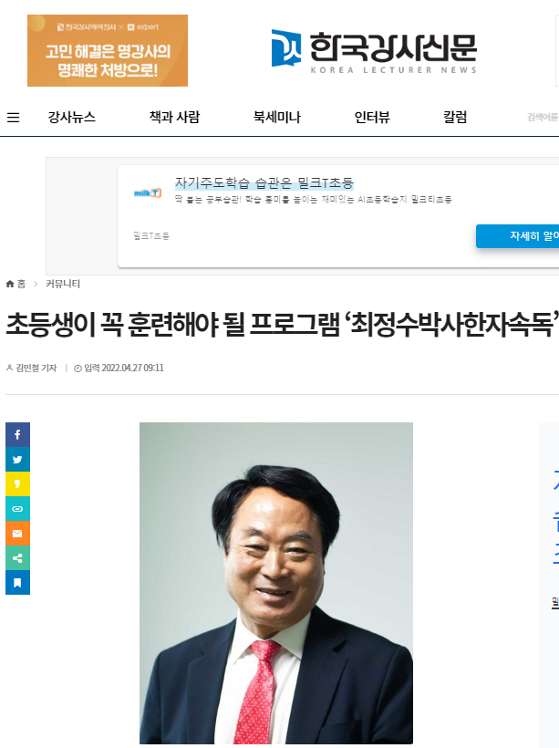 [한국강사신문 김민철 기자] 인생의 봄철이라 불리는 유·초등생 시기는 우수한 씨앗, 즉 어떠한 공부를 하느냐에 따라 인생의 가을에 성공의 열매를 열리게 할 수 있다.유·초등 때는 인격형성과 두뇌계발의 황금기로 불리는 중요한 시기로, 두뇌를 명석하게 만드는 훈련이 제일 중요하다. 이를 바탕으로 바른 인성과 함께 국·영·수 등 모든 공부를 잘할 수 있다. 두뇌계발과 집중력을 강화시키지 않는다면 공부를 아무리 열심히 해도 배운 내용을 잘 잊어버리므로 좋은 결과가 나타나지 않는다.두뇌가 계발된다는 사실은 오늘날까지 모든 이들이 알고 있었지만, 관련된 프로그램이 없었기 때문에 어쩔 수 없이 각 과목 공부만 열심히 할 수밖에 없었다. 천재는 1%의 영감과 99%의 노력으로 이루어진다는 에디슨의 어록뿐 아니라 동서고금을 막론하고 많은 학자들과 과학자들의 연구결과가 두뇌는 정확한 훈련에 의하여 반드시 계발된다는 사실을 알 수 있다.이와 같은 교육환경을 개선하고자 나타난 것이 ‘최정수박사한자속독’이다. 최정수 박사가 두뇌계발과 집중력 학문을 30여 년간 연구하여 발명특허를 획득한 프로그램인 최정수박사한자속독은 지난 19년 동안 초등 방과후 및 공부방, 학원 등에서 우수성이 입증되어 수강생이 정원을 넘고, 대기자가 줄을 잇는 현상이 일어난 바 있다. 왜 수강생이 많이 모일까?본 프로그램은 어느 한 지역 학생들만 공부할 것이 아니라 전국 어느 곳이라도 두뇌계발 황금기인 초등생이면 한 명도 빠짐없이 획기적인 교육혜택을 골고루 받아야 되는 국운상승 교육이다.최정수박사한자속독은 한자를 활용하여 좌뇌·우뇌 활성화로 두뇌계발, 마음의 근육인 집중력 강화, 한자를 반복적인 학습원리에 의하여 이미지를 빨리 습득하여 장기 기억, 각 급수를 쉽게 취득할 수 있다. 이외에도 과학적인 안구운동을 도와 시력 강화 및 독서능력을 향상시킨다.‘올바른 인성과 두뇌계발은 바늘과 실’이라는 뇌생리학에 맞추어 두뇌훈련 중 자연스럽게 올바른 인성(본심)이 활성화하도록 만든다. 이를 통해 학폭근절은 물론 장래 우리 사회 각종 사회악을 일소하는 역군이 된다.최정수 박사는 “최정수박사한자속독은 과학적으로 훈련되는 메타인지 발명특허 융합 프로그램으로, 국가발전의 원동력이 될 것이다. 그래서 초등생 필수과정이다”라고 전했다.본 프로그램은 현재 배우겠다는 학생은 많으나 그에 반해 강사가 부족한 상황이다. 이에 강사양성 인터넷 교육을 실시하고 있다. 또한 서울지역 강사 00명 긴급 모집하고 있다.자세한 내용은 최정수 박사 교수연구실 또는 공식 홈페이지에서 확인할 수 있다.출처 : 한국강사신문(http://www.lecturernews.com)