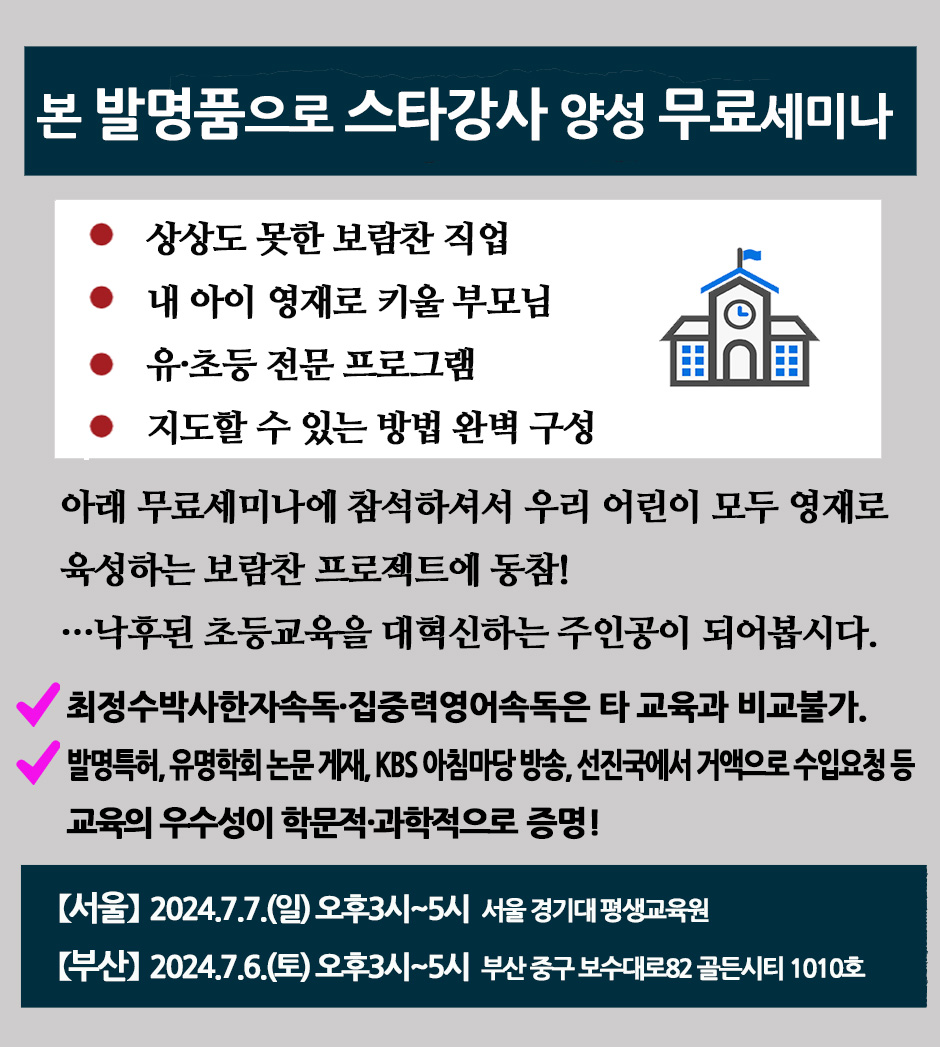 *한자 및 초등영어, 어차피 배워야 되는데 기존의 암기식보다 훨씬 능률적으로 학습되는 것만 해도 학생들에게 많은 도움이 되는데, 더 중요한 것은 좌뇌·우뇌가 계발되고 마음의 근육인 집중력이 강화되어 중·고·대학에서 모든 공부를 잘한다는 획기적인 프로그램을 발굴하여 유·초등생들 지도하면 자연적으로 스타강사가 되어 교육자로 크게 성공할 수 있다.
